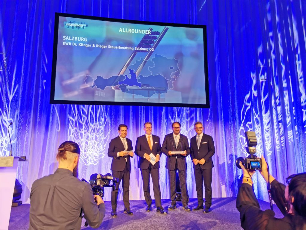 von links: diePresse Chefredakteur R. Nowak, IFA M. Baert, Dr. M. Klinger, Finanzminister Dr. M. BrunnerVerleihung des Steuerberater des Jahres Familie Klinger & Rieger